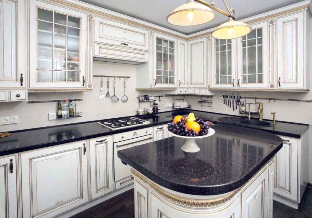 Черный лучше брать по структуре мрамора. Такая столешница позволяет спрятать изъяны, если будут порезы. К тому же необязательно выбирать каменные варианты, имитация под натуральный мрамор есть в пластике и в стандартном ДСП, МДФ.