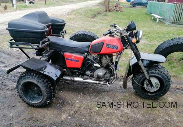 Трицикл собран на базе мотоцикла Иж Юпитер-5. Вместо заднего колеса, на раме установлен мост и пара колёс от квадроцикла.