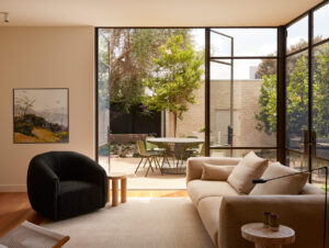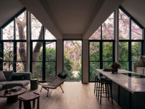 Этот коттедж в Сиднее получился очень необычным, с какой стороны не посмотри. Во-первых, архитектура — это современное прочтение амбарного стиля. Здесь мы видим знакомые формы и очертания экстерьера, но отделка фасада и обильное остекление делают дом стильным и