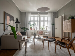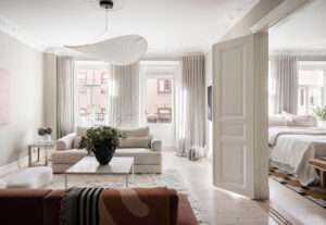 Этот светлый интерьер в Стокгольме — пример почти идеального дизайна двухкомнатной квартиры небольшой площади. Благодаря открытому пространству гостиной и кухни с выходом на балкон, а также большому количеству дневного света, пространство кажется очень просторным и
