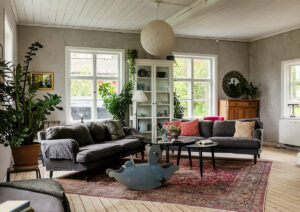 В просторной гостиной этой шведской дачи целых 5 больших окон, плюс высокие потолки и деревянные балки. Такой необычный набор характеристик для старого загородного дома недвузначно намекает на особенное прошлое дома — это бывшая сельская школа, построенная в далёких